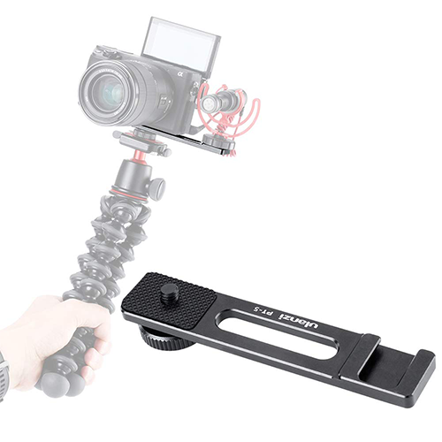 This Ulanzi PT-5 Vlogging Microphone Bracket connects to the bottom of compact cameras via a 1/4″-20 screw to horizontally mount a microphone or other small accessory that attaches via cold shoe. The bracket still allows you to mount your camera to a tripod or grip and keeps accessories out of the way of flip up monitors.